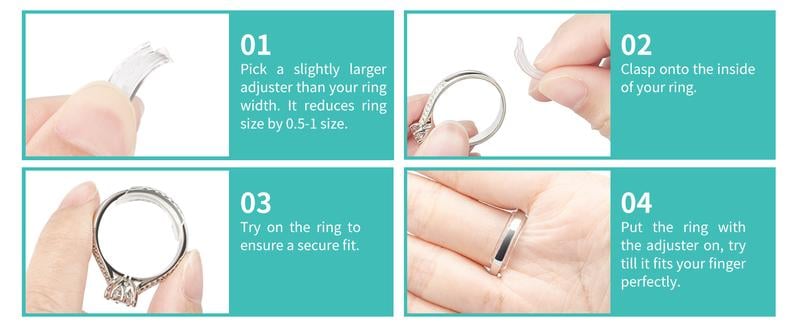 Ease of Use: Pick a ring size adjuster that is slightly larger than the width of the ring and snap it to the inside of the ring. Then try on the ring to make sure it fits. Easy to wear and adjust, can be used to fasten loose rings. Easily removes for cleaning and wipes away dirt with ease.